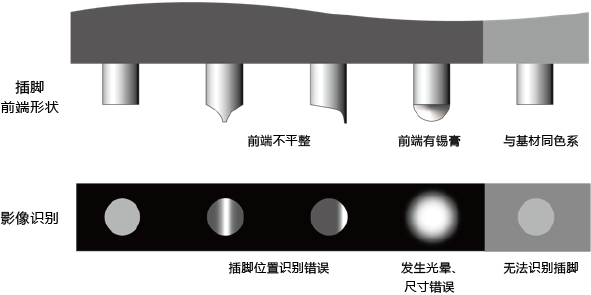 要想避免插腳前端形狀差異導(dǎo)致的識別錯誤,防止插入不良,必須配備能正確識別插腳前端影像的相機(jī)與照明方式。