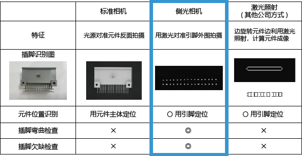 側(cè)光相機(jī)利用激光照射插腳的前端,是一種能清晰識別前端影像的有效方法,它可以捕捉到各式各樣前端形狀的插腳中心并準(zhǔn)確進(jìn)行定位,防止插入不良。