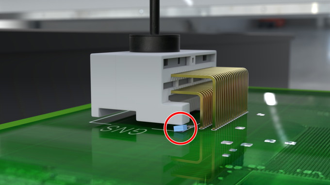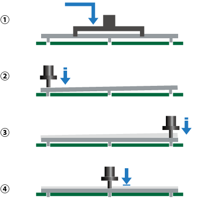 同樣是需要借助外力壓入的元件,對于那些元件本身硬度不足及屏蔽蓋等稍加用力就會導(dǎo)致變形的元件而言,還可以選擇另一種元件壓入功能。這種功能是在貼裝元件后,從多個點向元件施加壓力,能邊控制元件的受力負(fù)擔(dān)邊將元件完全壓入電路板。