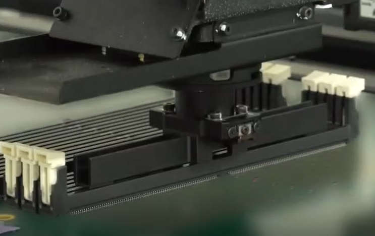 元件上面沒有平坦的表面供吸嘴吸取時,通常會采用機(jī)械夾夾持元件輪廓的方法處理。但是在面對DIMM插槽※3這種需要多個元件集中排列插裝時,元件跟機(jī)械夾之間會發(fā)生干涉而導(dǎo)致元件損壞。這種情況下,可以采用機(jī)械夾從元件內(nèi)部夾持的方法得到解決。